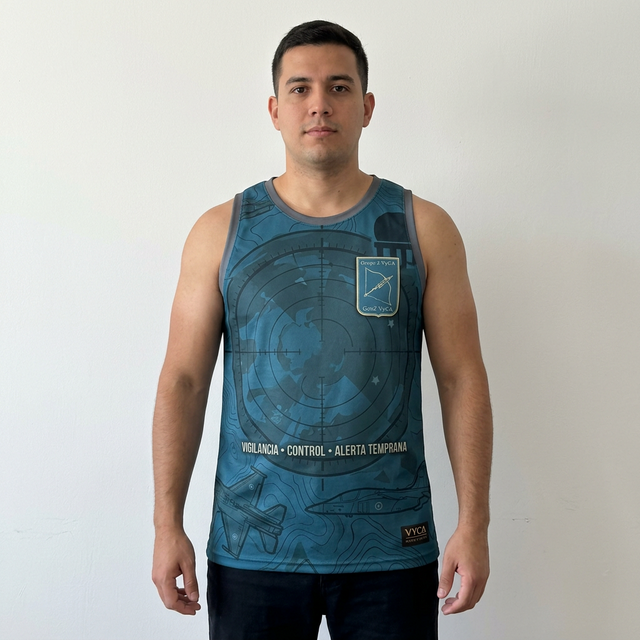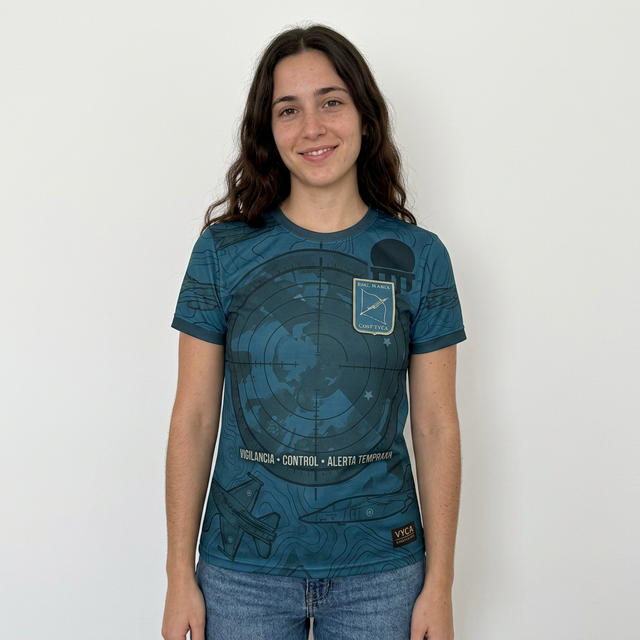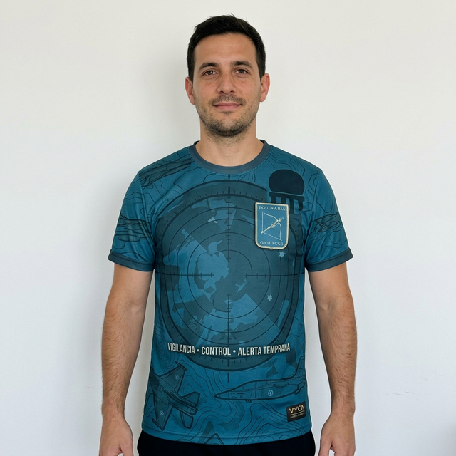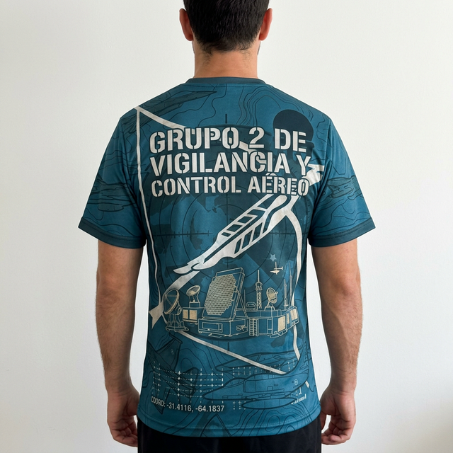 Remera Full Print premium dedicada al Grupo 2 de Vigilancia y Control Aéreo. Diseño técnico que incorpora gráficos de radar, curvas topográficas y la mística de la alerta temprana. Fabricada en poliéster técnico tacto algodón para máxima durabilidad y confort.