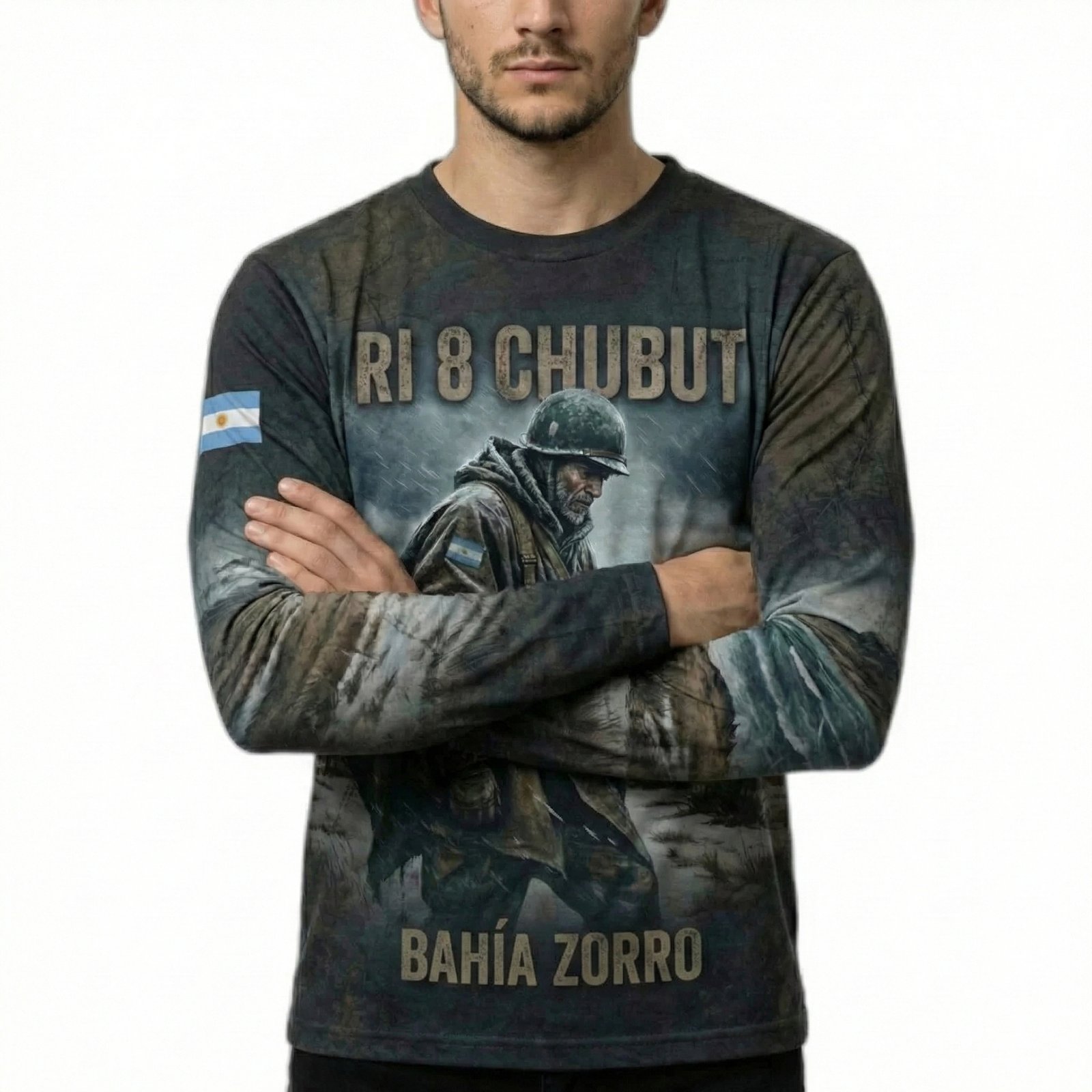 – **Estampado distintivo**: El logo “Malvinas RI 8 Chubut” está impreso con tintas ecológicas, lo que asegura una alta durabilidad y un acabado vibrante que resalta el sentido de pertenencia y orgullo regional.
