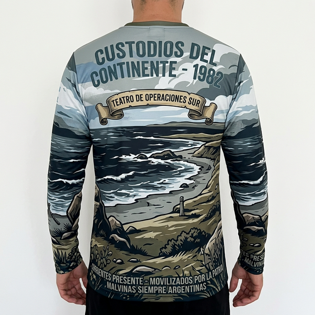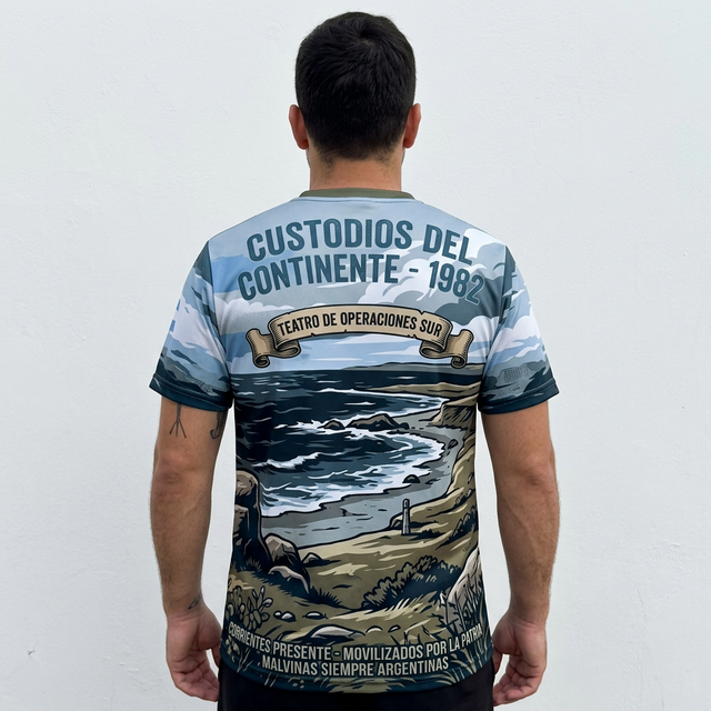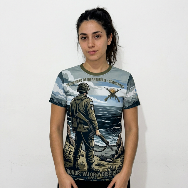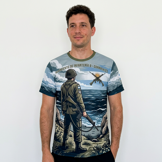 Remera Full Print premium homenaje al RI 9 – Corrientes. Diseño “Custodios del Continente” que captura la esencia de la vigilancia en el Teatro de Operaciones Sur durante 1982. Fabricada en poliéster técnico de alta calidad, tacto algodón, garantizando confort y durabilidad histórica.
